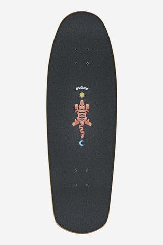 All-terrain havoc inducer, the Big Bad Bruiser - Lotus is a 10.375" x 32.5" x 16.5" wb cruiser, constructed from Resin-7 hard rock maple featuring graphics from artist Jannik Stegen. Rolling on Tensor ATG trucks and 78a Dragster wheels for maximum terrain shredding!