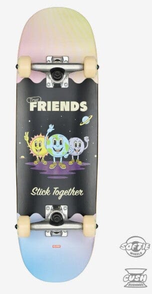 Kids Wide Mini True Friends is a scaled-down modern shape, short wheelbase complete board, designed especially for kids around the ages of 6-8 years old. The Resin-7 ply Hard Rock Maple deck is 7.9" wide x 27.25" length x 11.5" wheelbase and has mellow concave. It comes complete with 5.0" Tensor Alloy trucks that have softer bushings to make turning easier for lighter riders, and 51mm wide 95a street wheels.