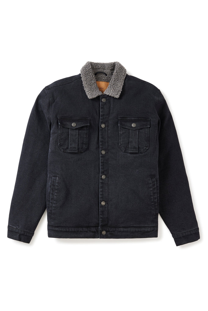 The Harris Denim Jacket is a cotton-spandex button-down made from a denim shell that offers a custom sherpa body liner, poly sleeve liner, sherpa collar & gussets. Side welt pockets and patchchest pockets.