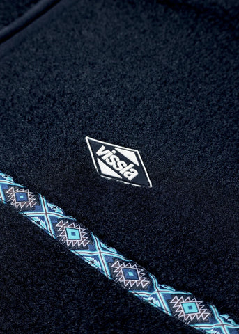 Heavy weight bonded recycled polyester sherpa and polar fleece fabric. Front full zip opening. Lycra binding at wrist hem and collar. 2 hand pockets. A Vissla woven patch as an identification on the front chest.