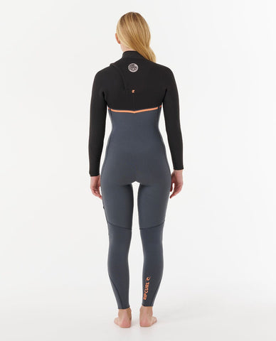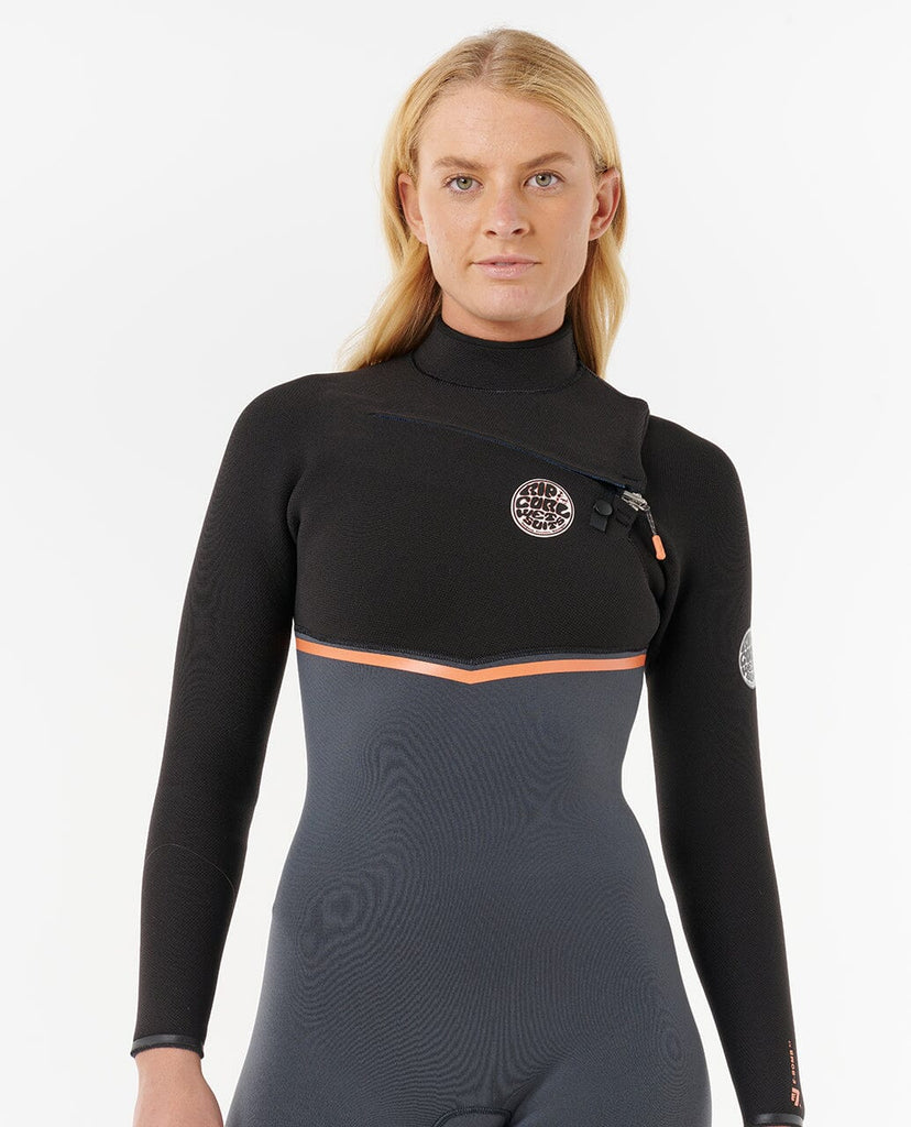 For flexibility without compromise, the Womens E-Bomb 4/3 Chest Zip Wetsuit Steamer combines E7 and E6 thermo linings with critical taping and sealed cuffs to keep warmth in and water out.